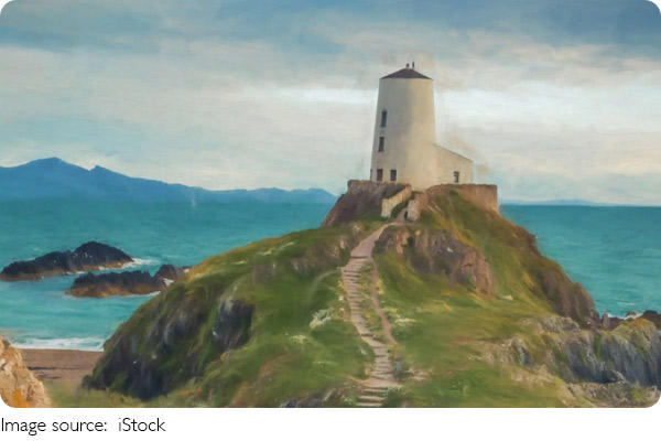 Маяк Тўр-Маур находится на скалистом мысе, который выступает в море, недалеко от города Лландудно в графстве Конви.