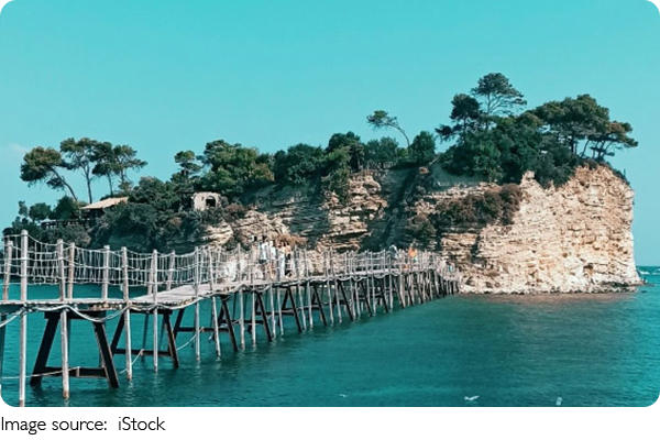 Остров окружен живописными скалами, которые омываются лазурной водой Ионического моря, создавая идеальные условия для фотографий и просто приятного отдыха. Попасть сюда можно по деревянному мосту, который соединяет Камео с основным островом и сам по себе выглядит весьма необычно.