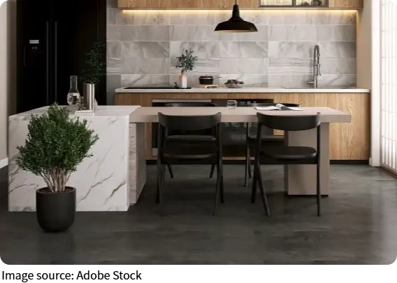 Современные интерьеры часто используют микробетон или плитку под бетон — и не зря: это стильный и минималистичный выбор. Такие покрытия отлично смотрятся в монохромной гамме (например, серо-серый), но раскрываются по-новому с контрастными акцентами: пыльно-розовый, горчичный, ржаво-оранжевый.